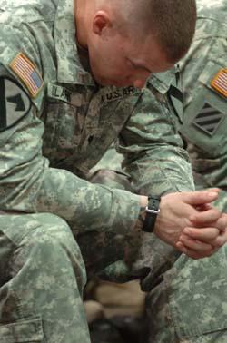 Soldier grasps the dog tags of his fallen comrade, Spc. Adam Rosema,