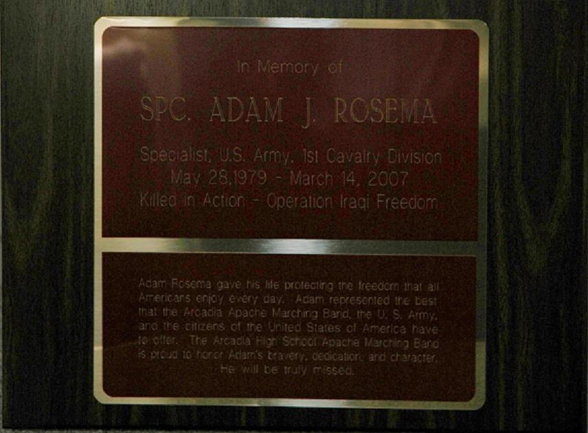 Arcardia High School Plaque - 11-17-2007 This was the date of the Arcadia Festival of Bands. At the end of the field show in the evening, the specialty trophy for high percussion was handed out to Chino High School in Adam's name. The inscription on the plaque was read by the announcer and Laura handed out the trophy. It is the intention of Arcadia High School to repeat this dedication at each year's festival.